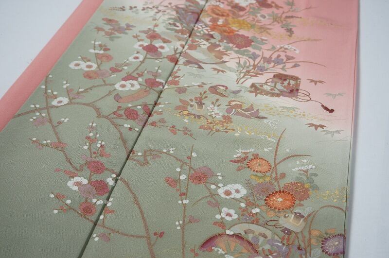 ■肌色のように優しく黄みがかったピンクの宍色(ししいろ)の、肌触りが良く光沢やきめ細かなシボが美しい上質なちりめん地に、落ち着いた品の良い淡い緑で染め分け、縁起の良い吉祥文の梅や牡丹、菊などの花々やオシドリ、短冊、貝桶なども描かれた繊細で美しい友禅に、金箔や金彩が散りばめられた上品で優美な訪問着です。