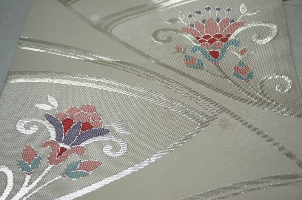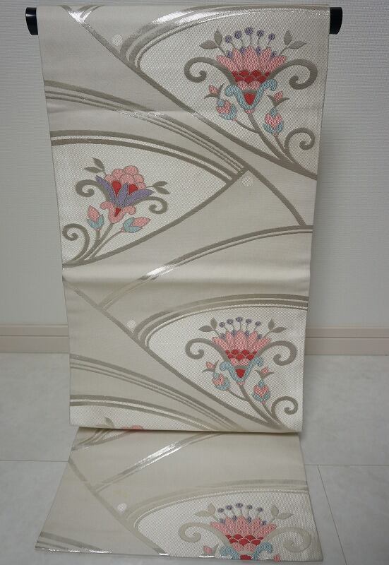 唐花 名古屋帯 正絹 白 銀糸 パステルカラー 099