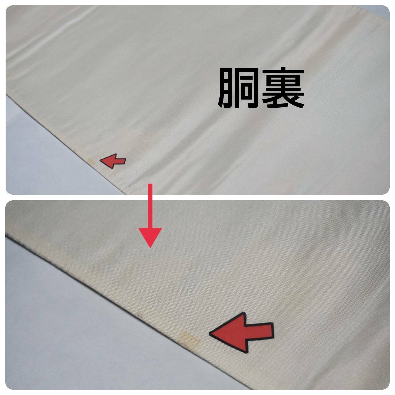 ・淡いクリーム色のような地色の胴裏や中無地ですが、若干の黄ばみも出ています。