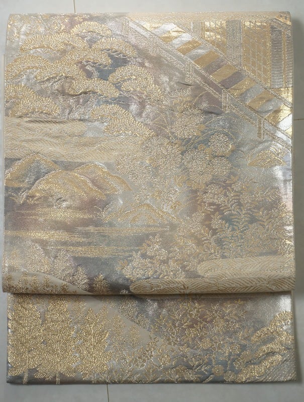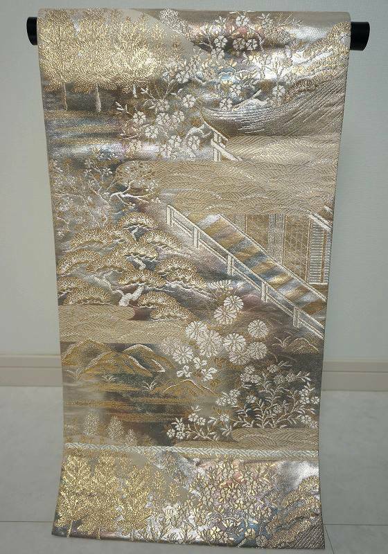 ■角度により色合いの変わる淡い紫や水色の美しい二重箔地に、金糸や銀糸をふんだんに使い縁起の良い吉祥文の松や桜、菊などの花々が散りばめられた趣のある京風景が描かれ、幻想的な霞取りが配されたとても豪華で素敵な袋帯です。