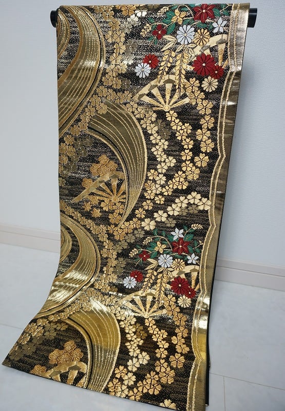 ■黒地に煌びやかな金糸をふんだんに使い、縁起の良い吉祥文の菊や藤などの花々が描かれ、流線や片輪車がスタイリッシュに配され、可愛らしい桜や梅の花びらが散りばめられた、豪華で艶やかな袋帯です。