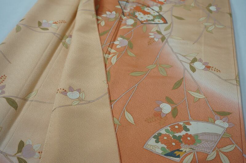 美品 友禅 橘 訪問着 扇 正絹 金彩 オレンジ 179