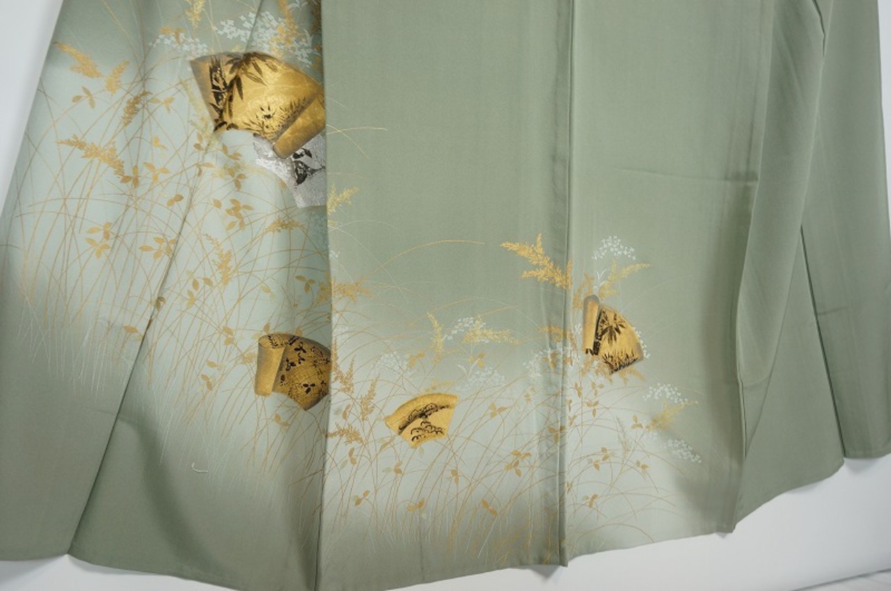 【単衣】 金彩 訪問着 草花 扇 ちりめん 正絹 金銀箔 黄緑 裏葉柳色 188