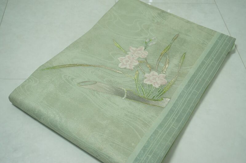 ■淡くさわやかな黄緑色に、金糸や銀糸、色箔等で織り出した涼し気な竹にかわいらしい水仙が描かれ、なめらかな流水を配した、とても素敵な色柄の清涼感ある名古屋帯です。