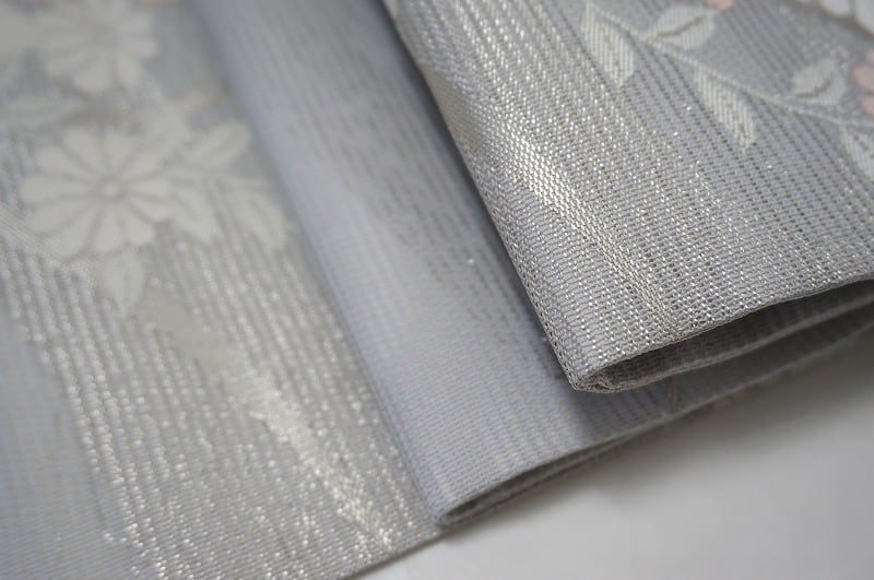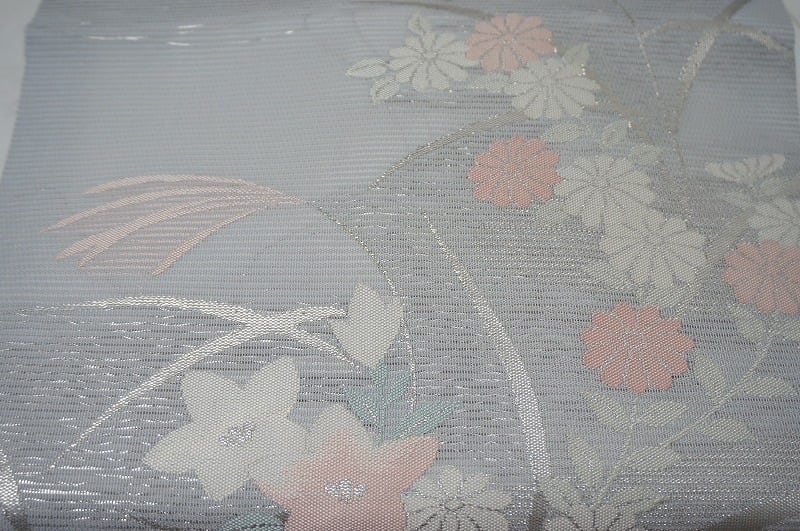 ■淡くさわやかな紫色に、淡いピンクや水色の色糸や銀糸を使い、可愛らしい花々を丹念に織りだした、女性らしさを引き立たせる色柄のとても素敵な名古屋帯です。