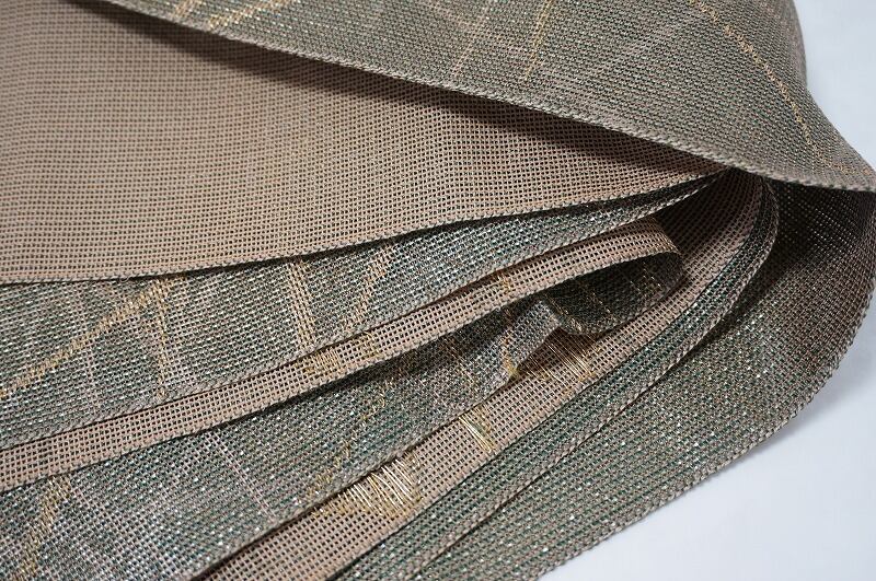 ■やや茶色みがかった渋い緑の岩井茶色、パリッとした風合いで透け感があり、とても軽やかに丹念に織り上げられております。