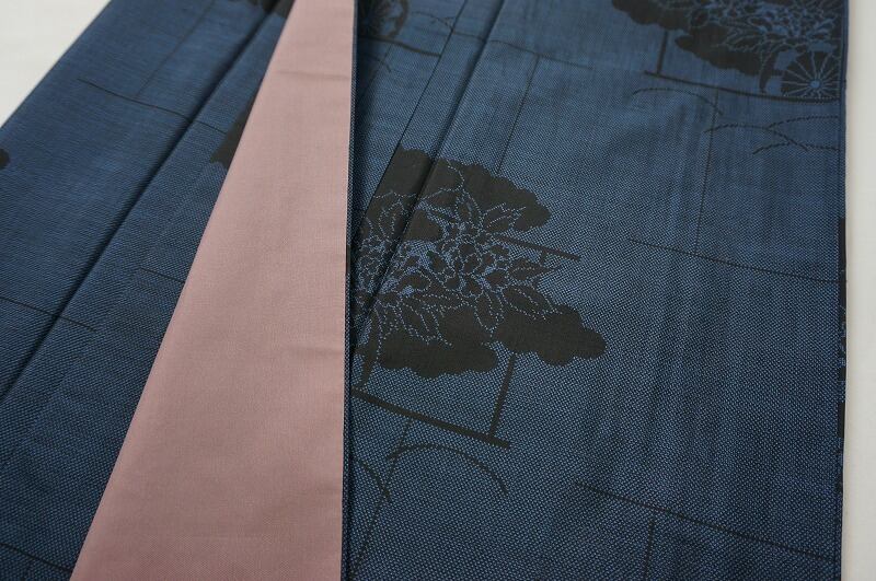 ■泥藍染め独特の奥深く美しい藍色地に、百花の王とされる優美な牡丹を乗せた花車に、縁起の良い吉祥文の瑞雲をあしらった柄は、7マルキの倍以上費やし、きめ細かくなめらかに織り出された意匠美。