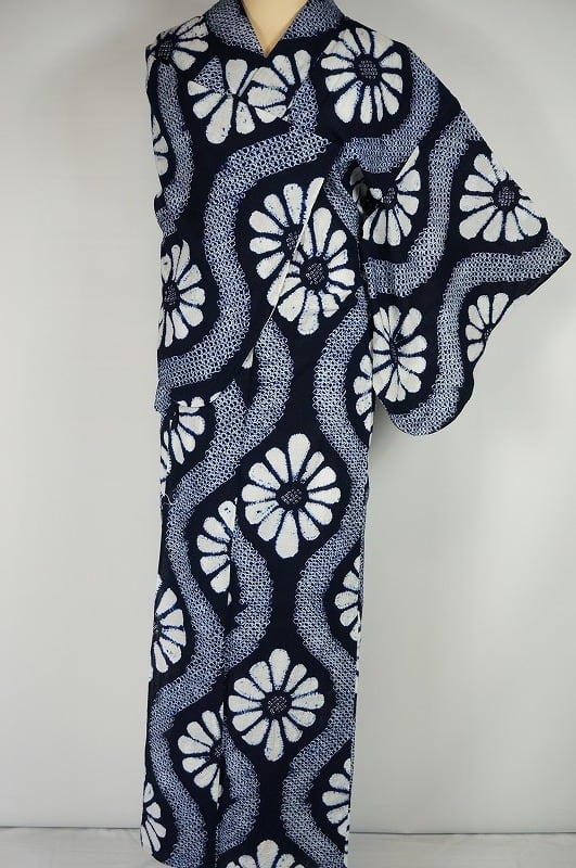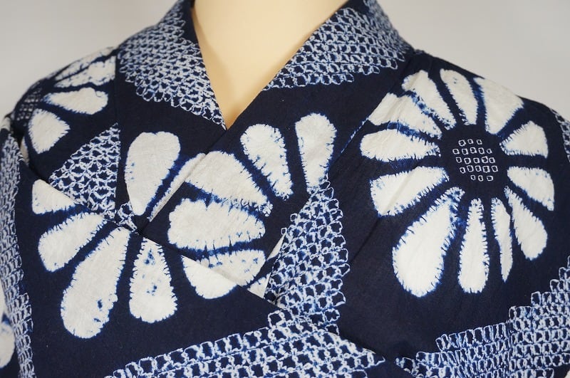 有松鳴海絞り【浴衣】大輪の菊 綿 総絞り 紺 白 005