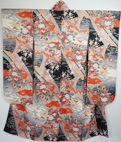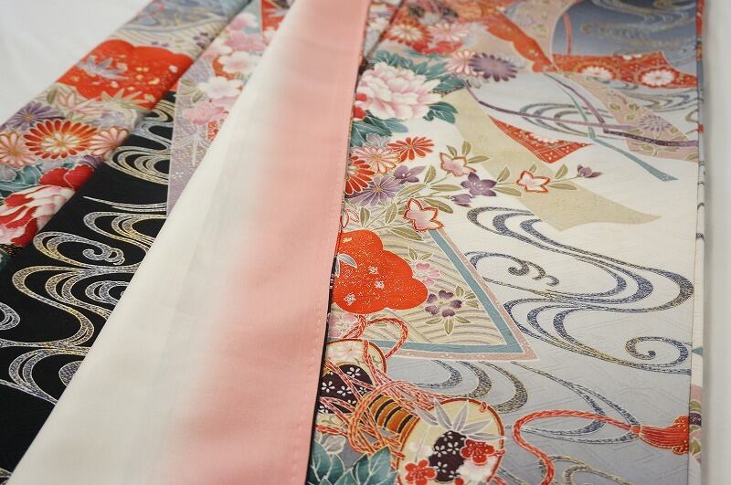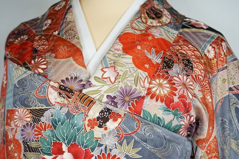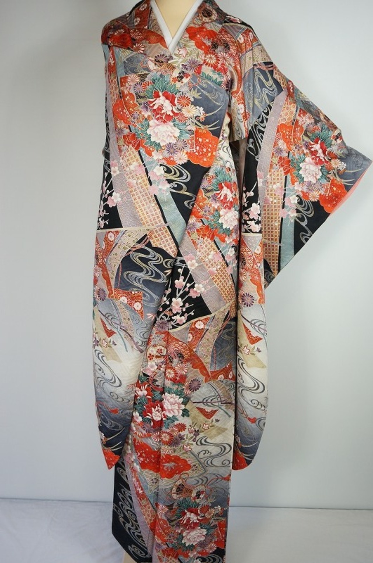 総柄 振袖 牡丹 菊 鼓 切りばめ柄 金銀彩 正絹 黒 赤 012