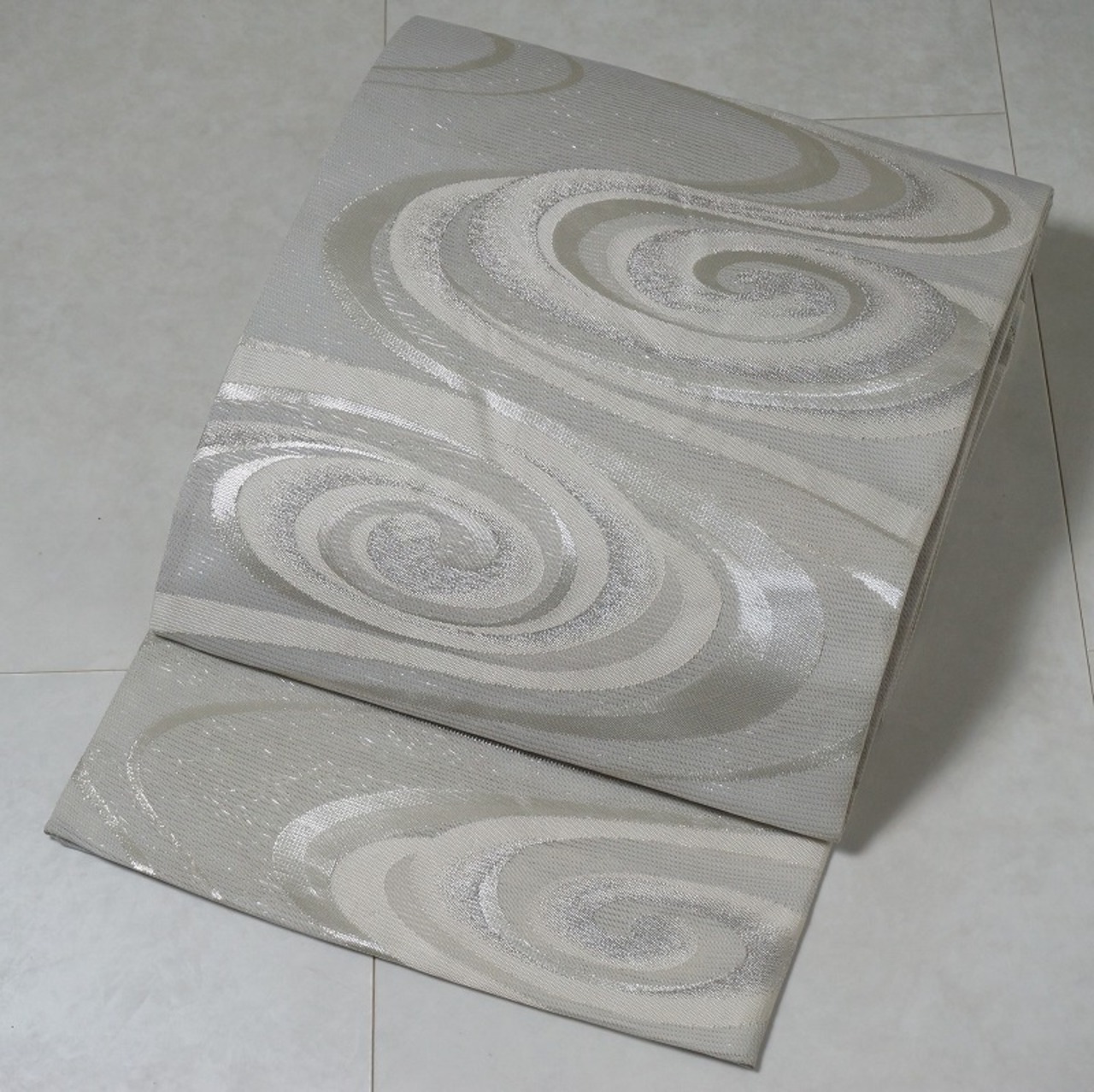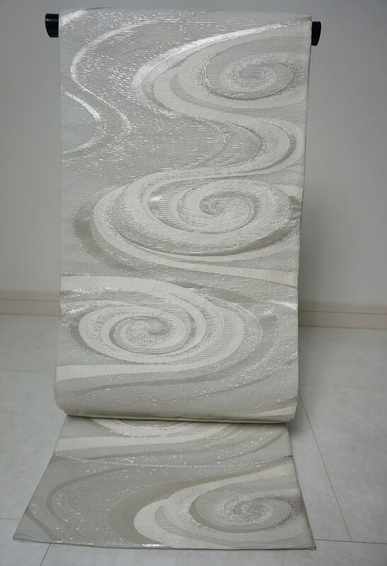 ■淡いグレー地に、煌びやかな銀糸を使い涼し気な流水を織り出した、とても粋な袋帯です。