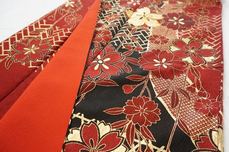 金駒刺繍 膨れ織り 振袖 花柄 金彩 正絹 黒 赤 013