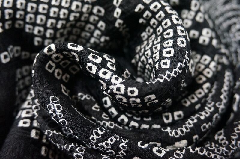 ■丹精込めて一粒一粒気の遠くなるような手仕事によるきめ細かな黒白の「京鹿の子絞り」、少し大きめの「小帽子絞り」の白が可愛らしくアクセントになり、上品な「茶屋辻」がモダンに描かれたとても素敵な柄行です。