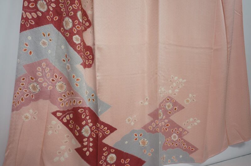 水色や紅色、ピンクの「変わり菱」や「雲取り」でモダンに染め分けられ、繊細な手絞りによる美しい「辻が花」が描かれた、可愛らしくとてもお洒落な訪問着です。