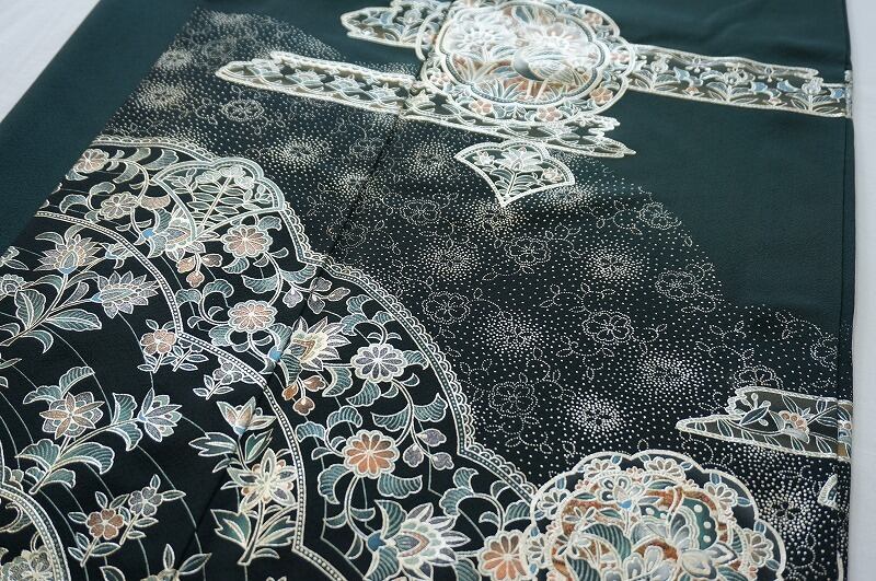 銀泥 洋風華紋 唐花 正絹 深緑 320