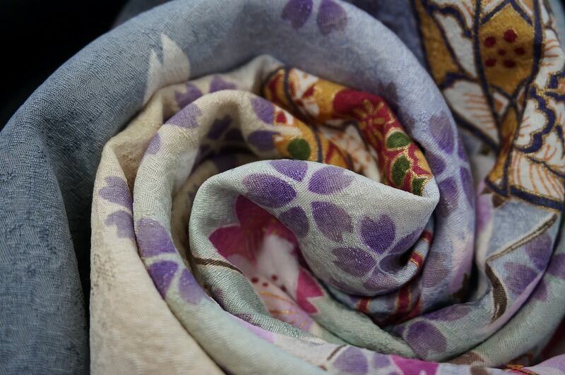 ■やわらかくしなやかな「正絹」地に、立体感があり奥行きの美しい「地紋」が丹念に織り出され、華やぎを添えております。