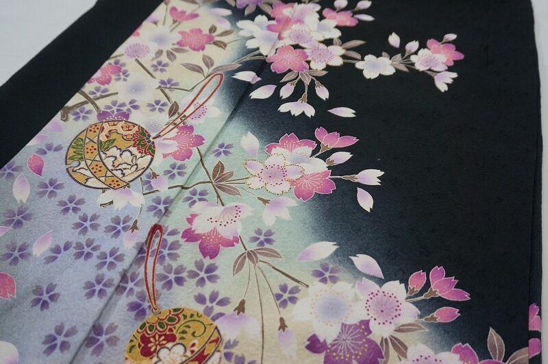 京都きもの友禅 振袖 桜 鈴 正絹 金彩 黒 ピンク 018