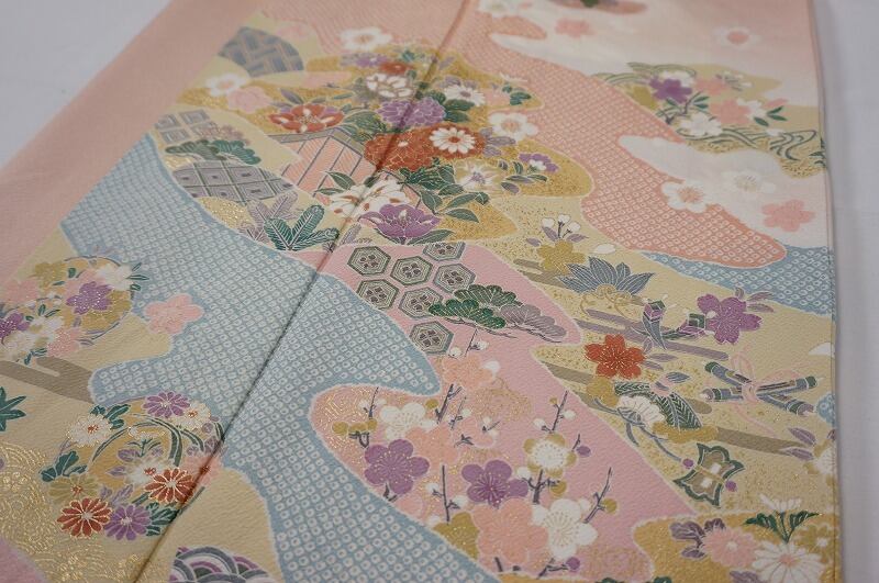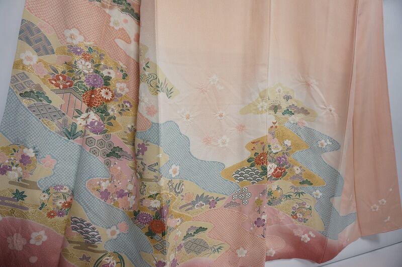 優雅な「霞取り」で鹿の子絞り柄や、縁起の良い「吉祥文」の牡丹・梅・松や、格調高い「有職文様」の亀甲・花菱・青海波、丸紋などが繊細に描かれ、煌びやかな金箔できめ細かな「金彩」を施し、丹念な手仕事による「絞り」をあしらった可愛らしい梅の花びらが散りばめられた美しい意匠の作品です。
