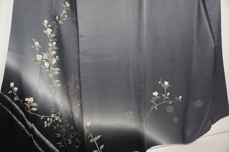 やわらかな白の「ぼかし染め」から黒への美しいグラデーションが施され、上品に煌めく「金銀箔」をふんだんに使った繊細な「金彩友禅」で優雅な花をあしらった、大人の色気溢れるシックな色使いの洗練されたとても素敵な訪問着です。