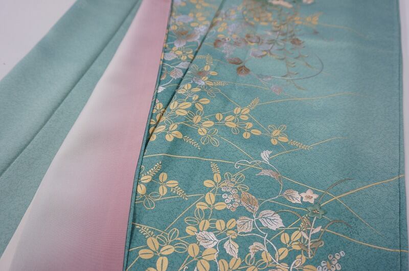 金泥 刺繍 葡萄 萩 訪問着 正絹 薄緑 ミントグリーン 黄緑 345