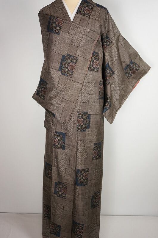 ■泥染めの奥深い茶色地に、数十色の鮮やかな「色泥染め」を使ったうっとりするほど美しい「華紋」や格調高い「七宝花菱」「唐花」を、和歌や俳句・絵など描く優雅な「色紙」に描いたとても素敵な柄行です。