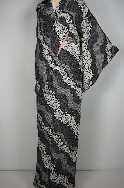 辻が花 絞り柄 ちりめん 小紋 斜めよろけ縞 正絹 黒白 グレー 377