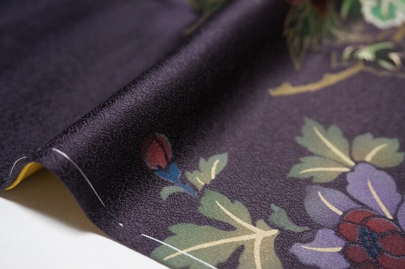 未使用 紋意匠 金彩友禅 牡丹 訪問着 扇 正絹 濃色 紫 376