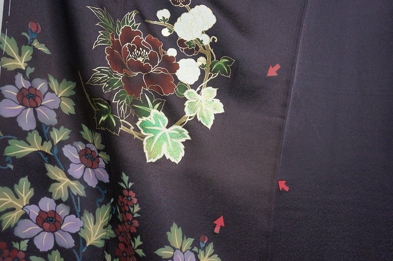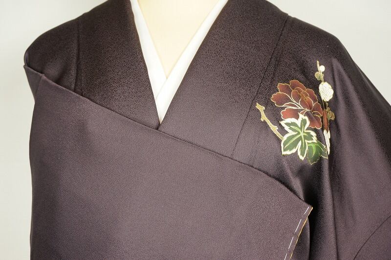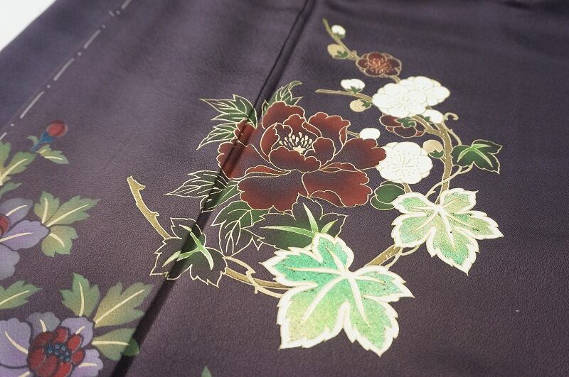 美しい「型染め」に繊細な手描きが添えられ、モダンに描かれた大柄な「牡丹」が華麗に散りばめられ、左身頃と左胸には豪華な「金彩友禅」で牡丹に梅を配した、とてもお洒落でエレガントな訪問着です。