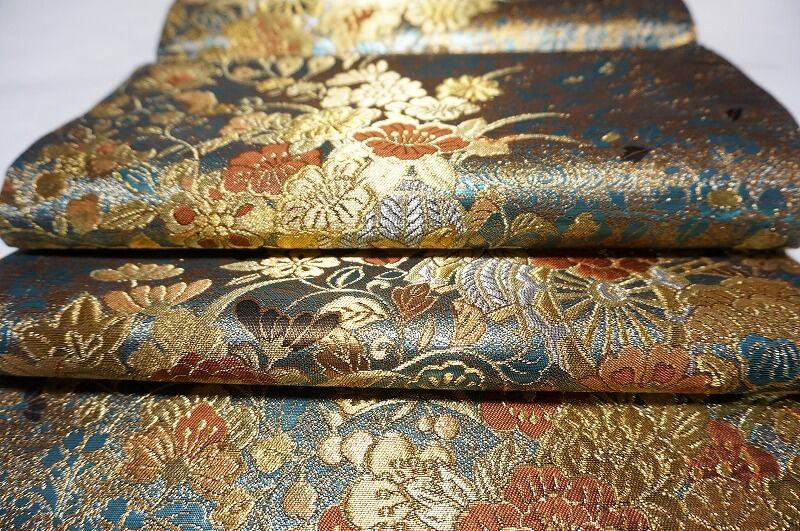 ■深い青緑のように煌めく美しい地に、「金糸」や「銀糸」をふんだんに使い、縁起の良い「吉祥文」の牡丹や菊、優雅な唐花を散りばめた「花づくし」をきめ細かく丹念に織り上げた、気品高くエレガントな高級袋帯です。