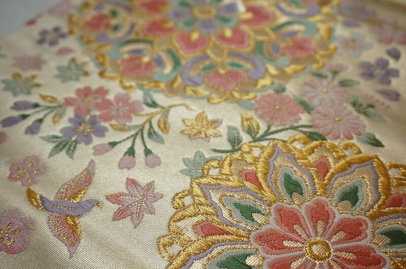 ■白糸に「金箔」が織り込まれた上品に煌めく淡いベージュ地に、刺繍のようにふっくらとした格調高い「唐織り」で細密に織り出した華紋に、縁起の良い「吉祥文」の桜・梅・菊などの花々が散りばめられた、女性らしさを引き立たせる柄行です。