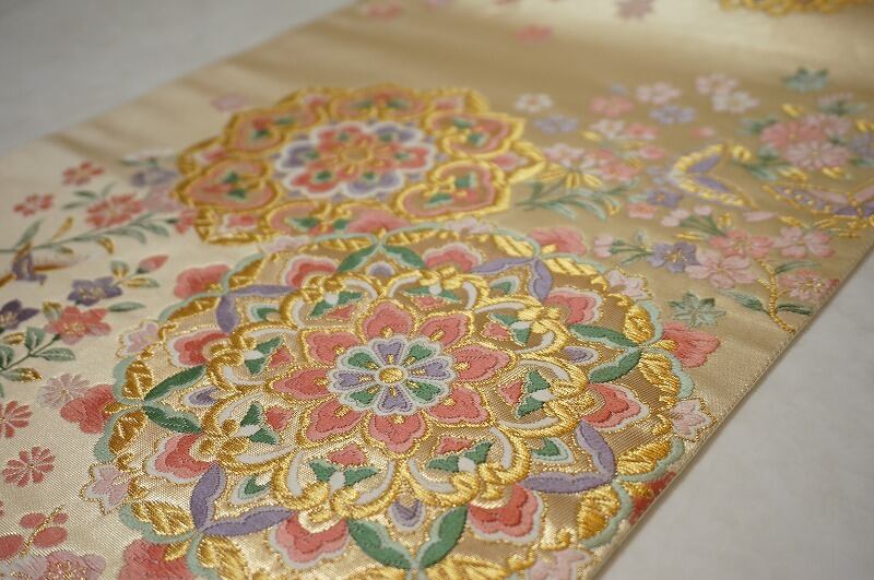 唐織り 華紋 袋帯 正絹 金糸 ベージュ パステルカラー 205