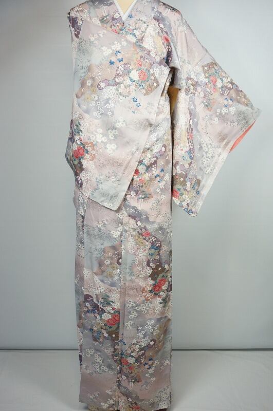 未使用 友禅 金銀彩 小紋 四季の花々 正絹 ピンク 紫 403