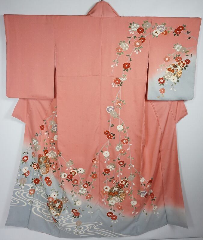 やわらかな「ぼかし染め」で淡い水色との「染め分け」のコントラストが美しく、左胸と右肩より優雅に枝垂れたモダンな花柄を、繊細な「手描き友禅」で丹念に施し、煌びやかに光り輝く「銀箔」をふんだんにあしらった丸紋を配した、華やかで洒落た柄行です。