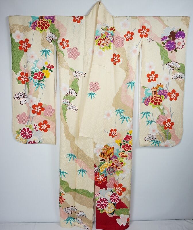大柄でレトロモダンに描いた、縁起の良い「吉祥文」の松竹梅や牡丹・菊などの花々を散りばめ、「雪輪」をあしらい、煌びやかな「金駒刺繍」や「刺繍」を左胸と上前に施した、豪華な仕上げになっております。