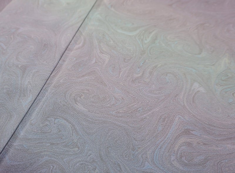水面に墨汁または顔料を落として、その波紋の模様を紙や布に写しとる「墨流し」で染めたものです。