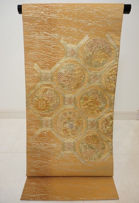 上品に煌めく「金箔」で風合いの良い模様を丹念にあしらい、卓越した職人の手仕事による「汕頭刺繍」「相良刺繍」で縁起の良い「吉祥文」の牡丹・菊・杜若などの四季の花々を描き、その上に豪華な「金泥」を施し、格調高い「蜀江文」で配した、気品高い袋帯です。