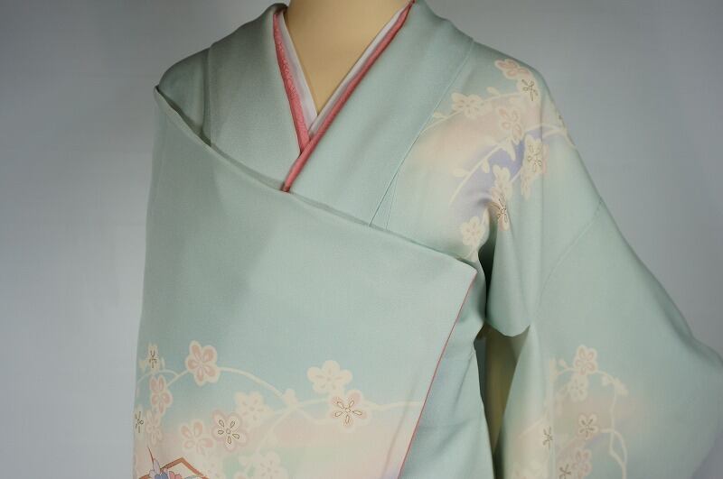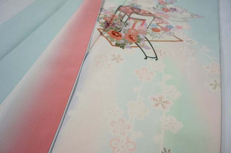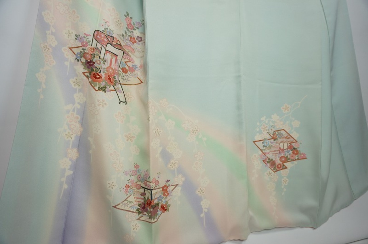淡く優しいパステルカラーの黄緑・ピンク・紫で、虹のような「ぼかし染め」のグラデーションに美しい「枝垂れ梅」をあしらい、上品に煌めく「金彩」を施した優雅な「御所車」や四季の花々を配したとても素敵な作品です。