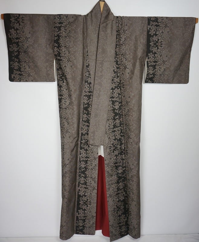 ■奥深い「泥染め」の茶色と黒のコントラストが美しく、優美な花々をスタイリッシュな縦縞に配した、シックな色使いにエレガントな柄行の、大人の色気溢れる高級お洒落着です。