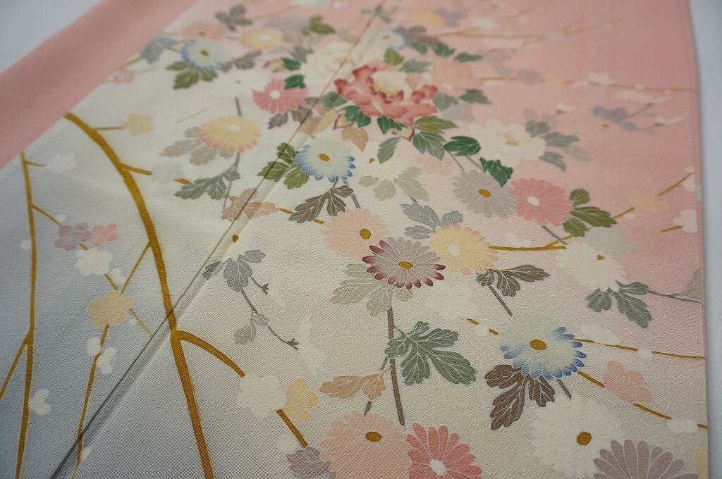 淡い黄色から水色への「ぼかし染め」でふんわりとした優しいグラデーションを施し、縁起の良い「吉祥文」の牡丹・菊・梅などの四季の花々を、『加賀友禅』の色彩の特徴である「加賀五彩」で美しく彩られ、繊細な手描き友禅による「外ぼかし」の技法や「虫喰い」が描かれた、とても優雅な柄行です。