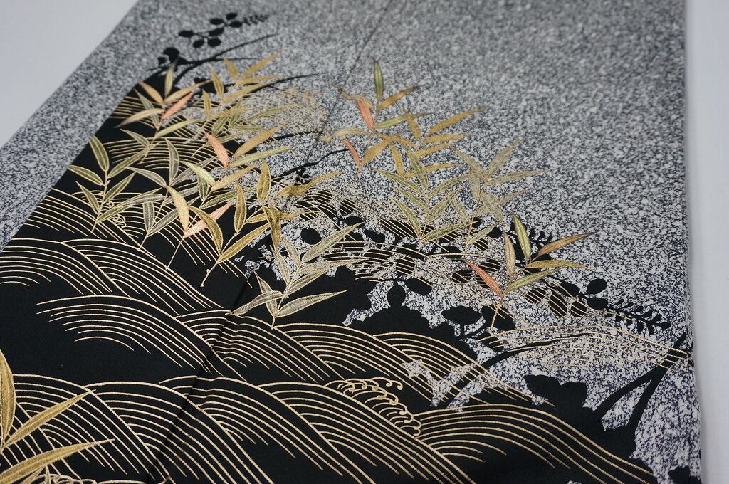 三越謹製 蝋叩き染め 金彩友禅 竹 訪問着 正絹 黒 白 グレー 498