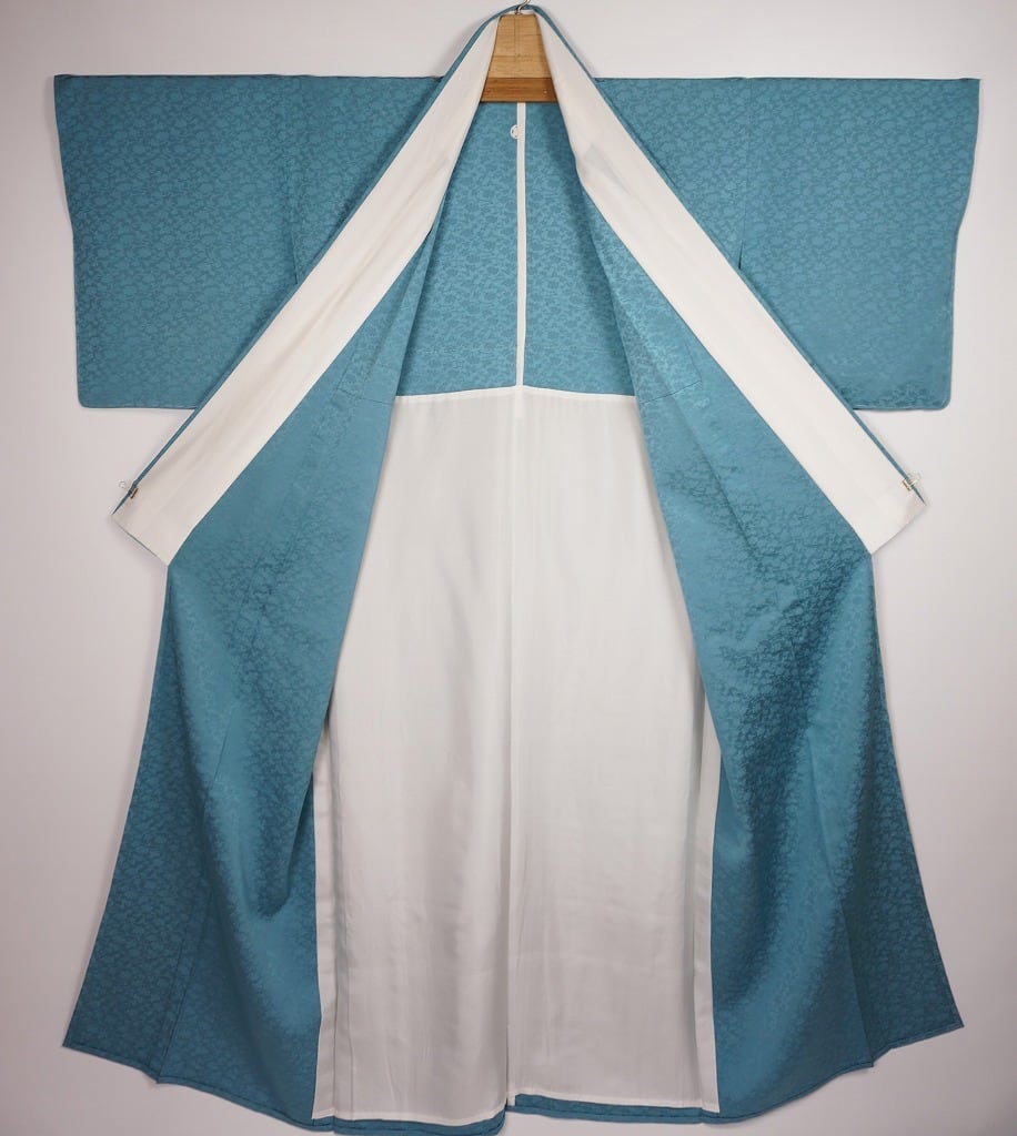 未使用【単衣】紋意匠 色無地 正絹 一つ紋 孔雀青 青 496
