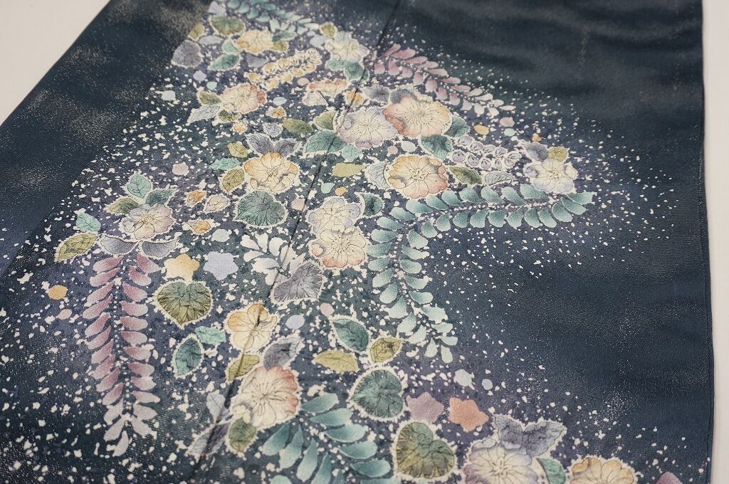 ターコイズグリーンやパープルなどの色使いで、多彩な「ぼかし染め」「友禅」「手絞り」を駆使し、華麗に咲き誇る「辻が花」をあしらい、丹念な手仕事による「蒔糊散らし」を施した、とても素晴らしい作品です。