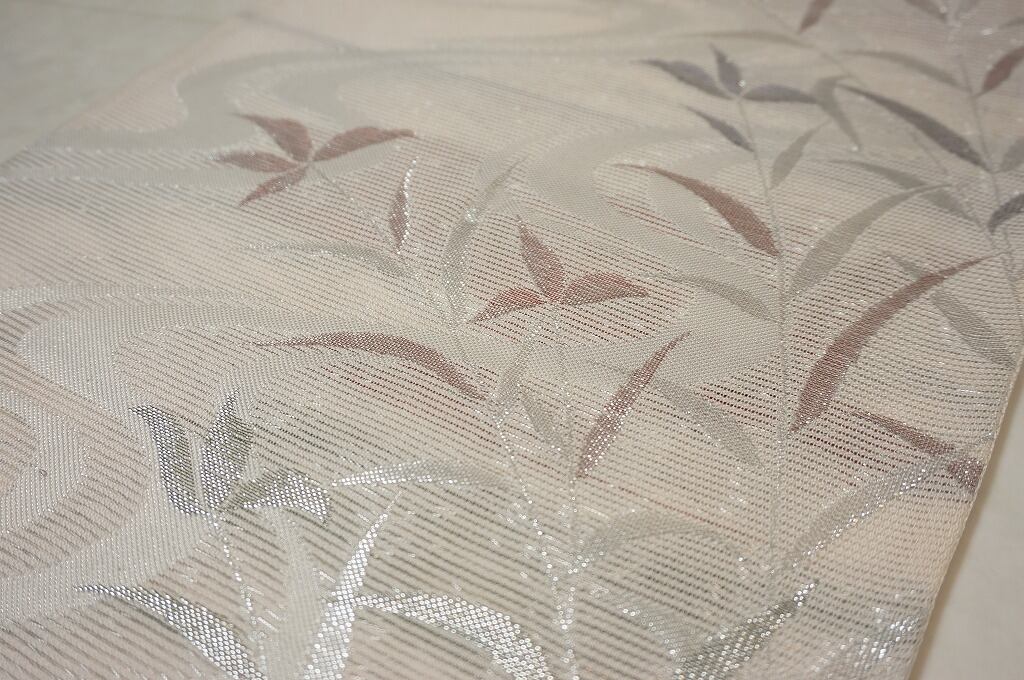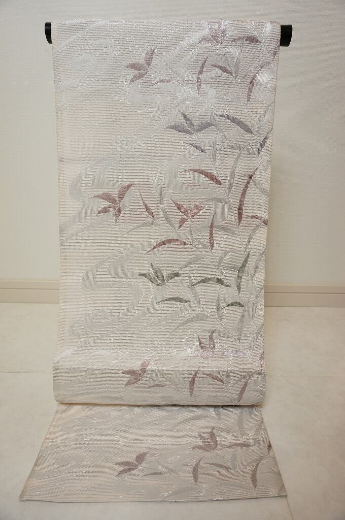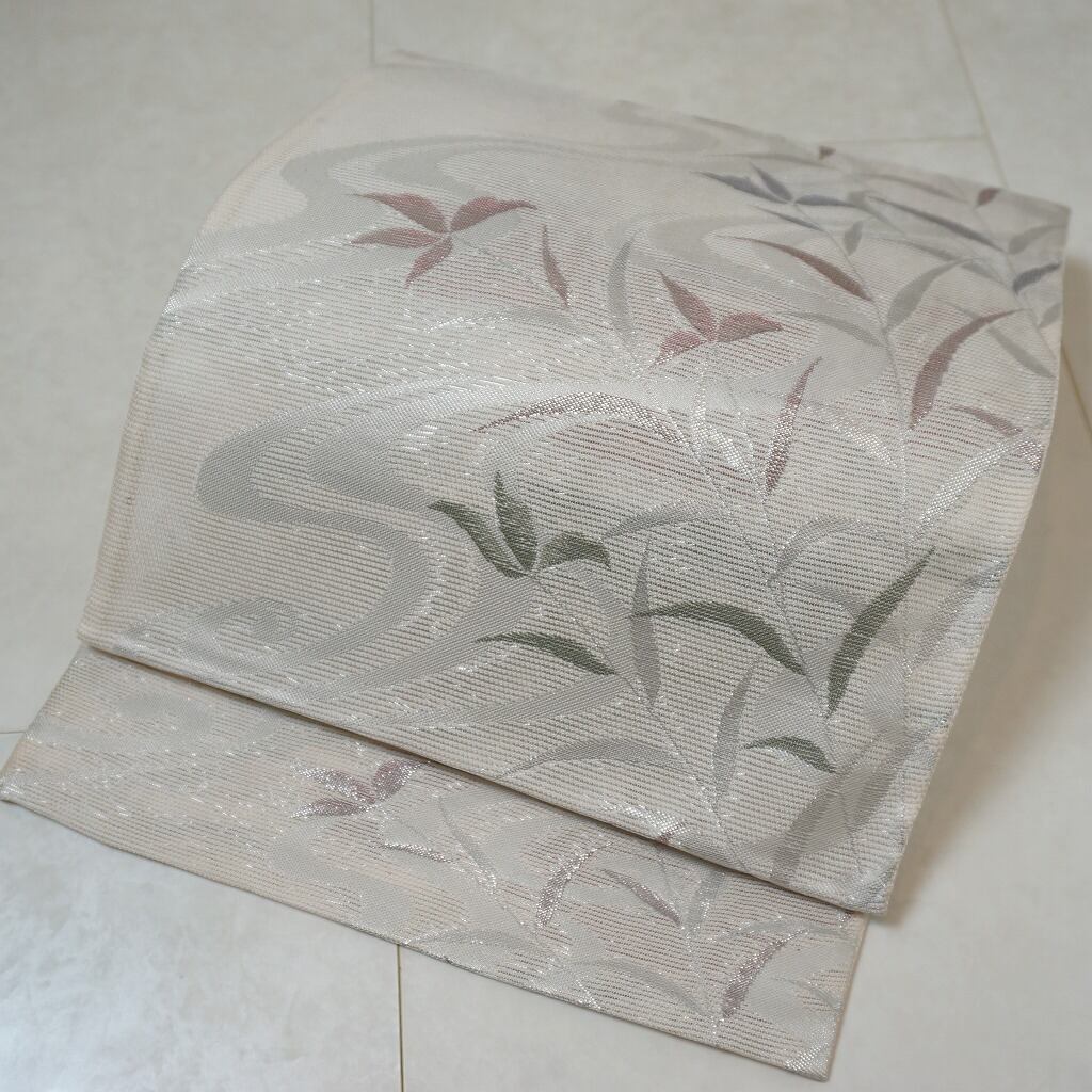 上品に煌めく「銀糸」をふんだんに使い、涼し気な流水に草花を丹念に織り出した、爽やかな色柄のとても粋な「絽」の京袋帯です。
