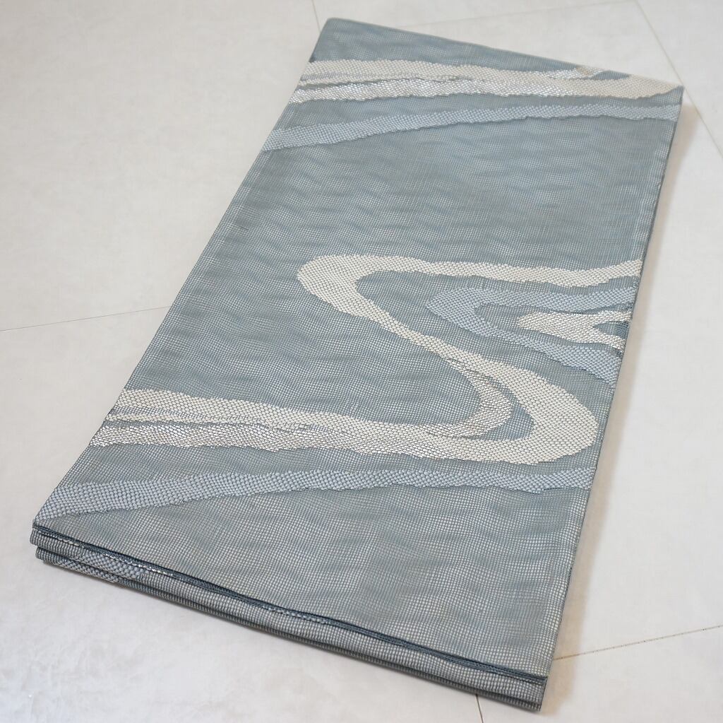 ◇水色・白・銀糸を使い丹念に編み込み、モダンな「流水」をあしらった、とても粋な紗の袋帯です。