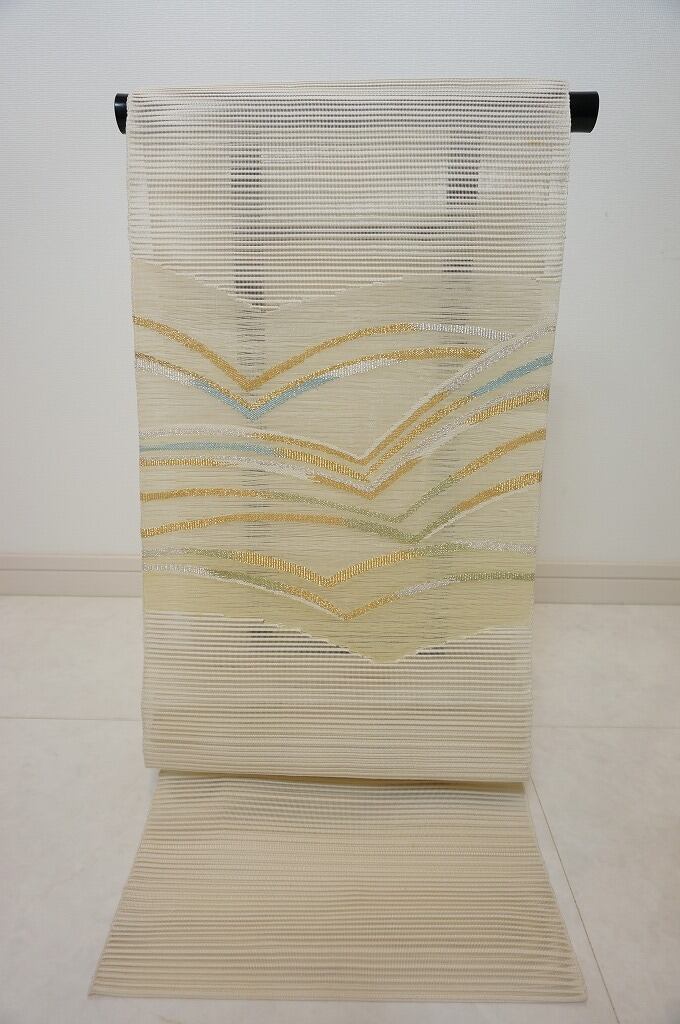 未使用【夏帯】絽綴れ 名古屋帯 絹 金銀糸 生成り色 256