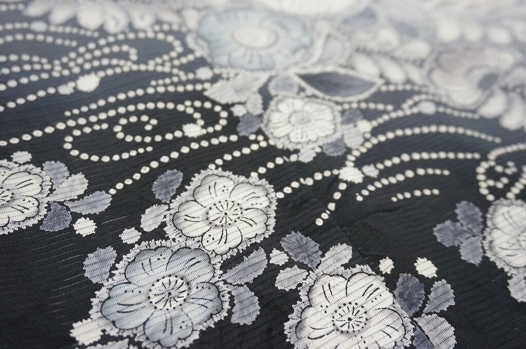 グレーから黒へのやわらかな「ぼかし染め」のコントラストが映え、多彩な「友禅」「手絞り」により優雅に描かれた「辻が花」に、さりげなく煌めく「銀彩」を散りばめた、意匠美の作品です。