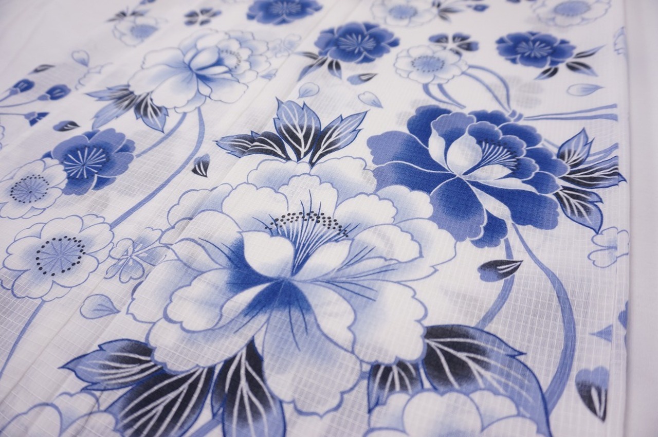 ◇清楚な白地とのコントラストが美しい涼し気なブルーで、「百花の王」とされる大輪の牡丹や「辻が花」のような花々をあしらい、桜の花びらを散りばめた、気品高く華やかな「絵羽模様」が目を惹く、とてもエレガントな浴衣です。