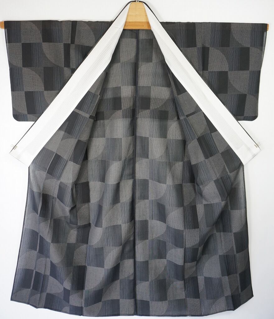 ■黒みのある深いグレー地に、モダンな「市松」を丹念に織り出した、大人の魅力溢れるとても洒落た柄行の、大変希少な「夏結城」です。