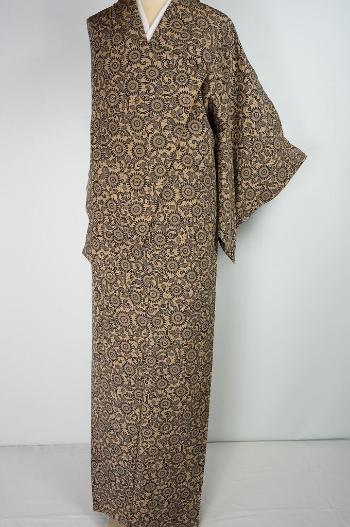 未使用【単衣】菊唐草 小紋 正絹 ベージュ 黒 560