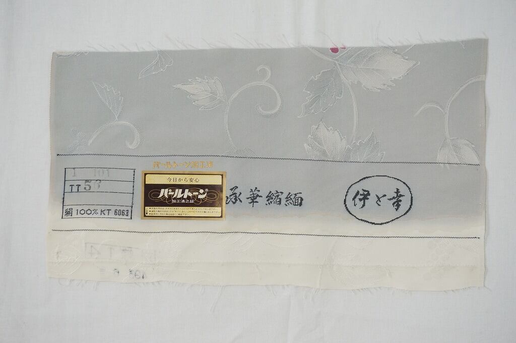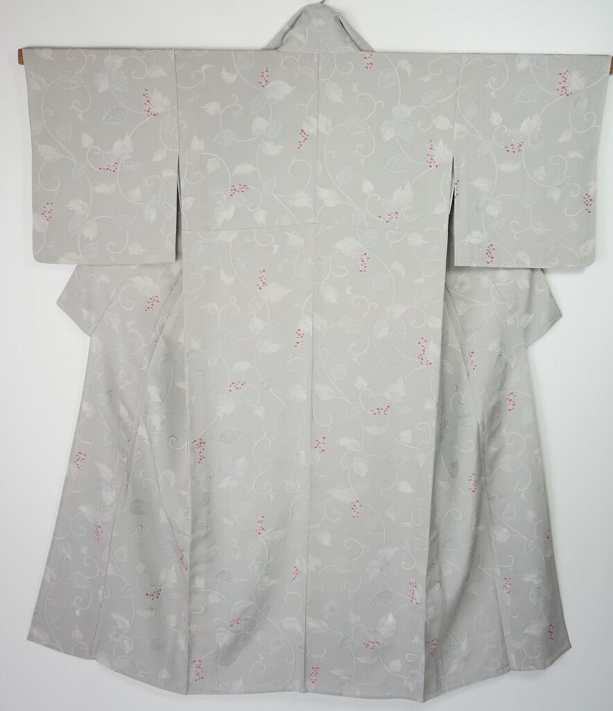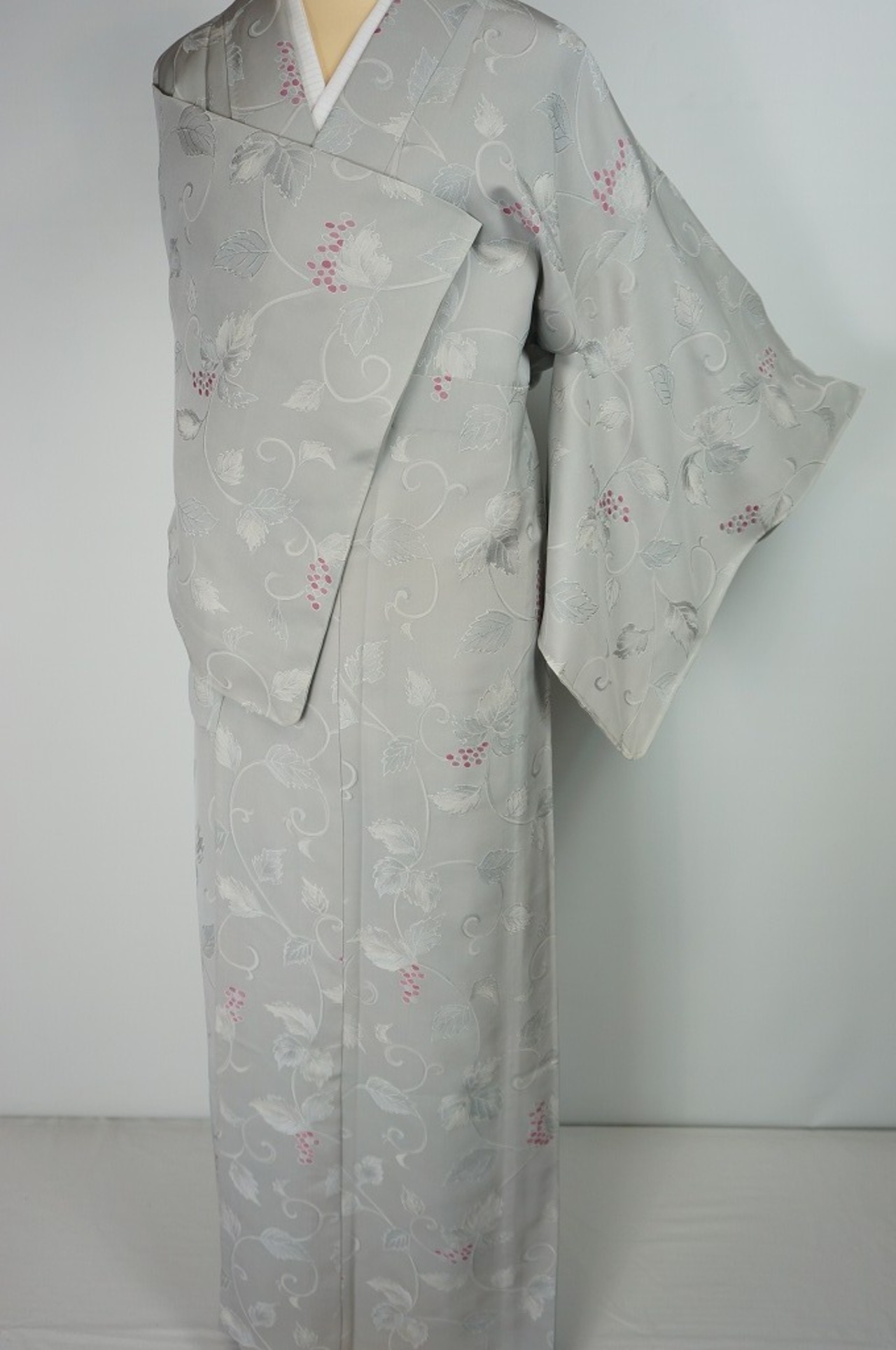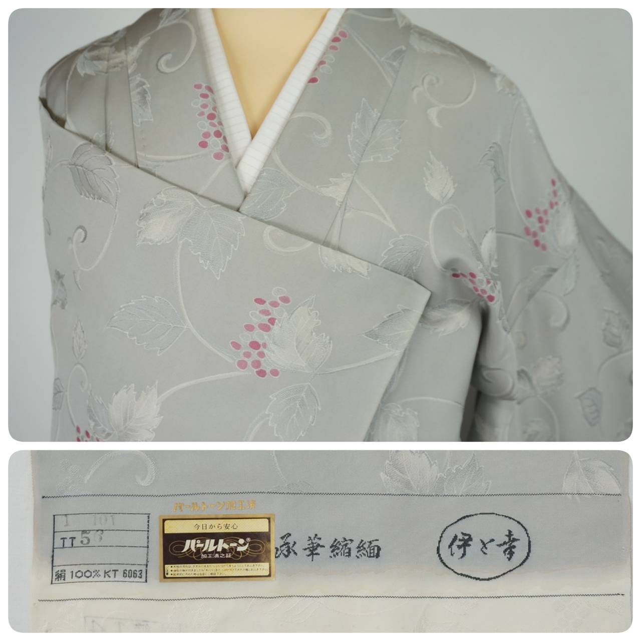 伊と幸【単衣】未使用 承華縮緬 葡萄唐草 小紋 正絹 グレー 紫 561
