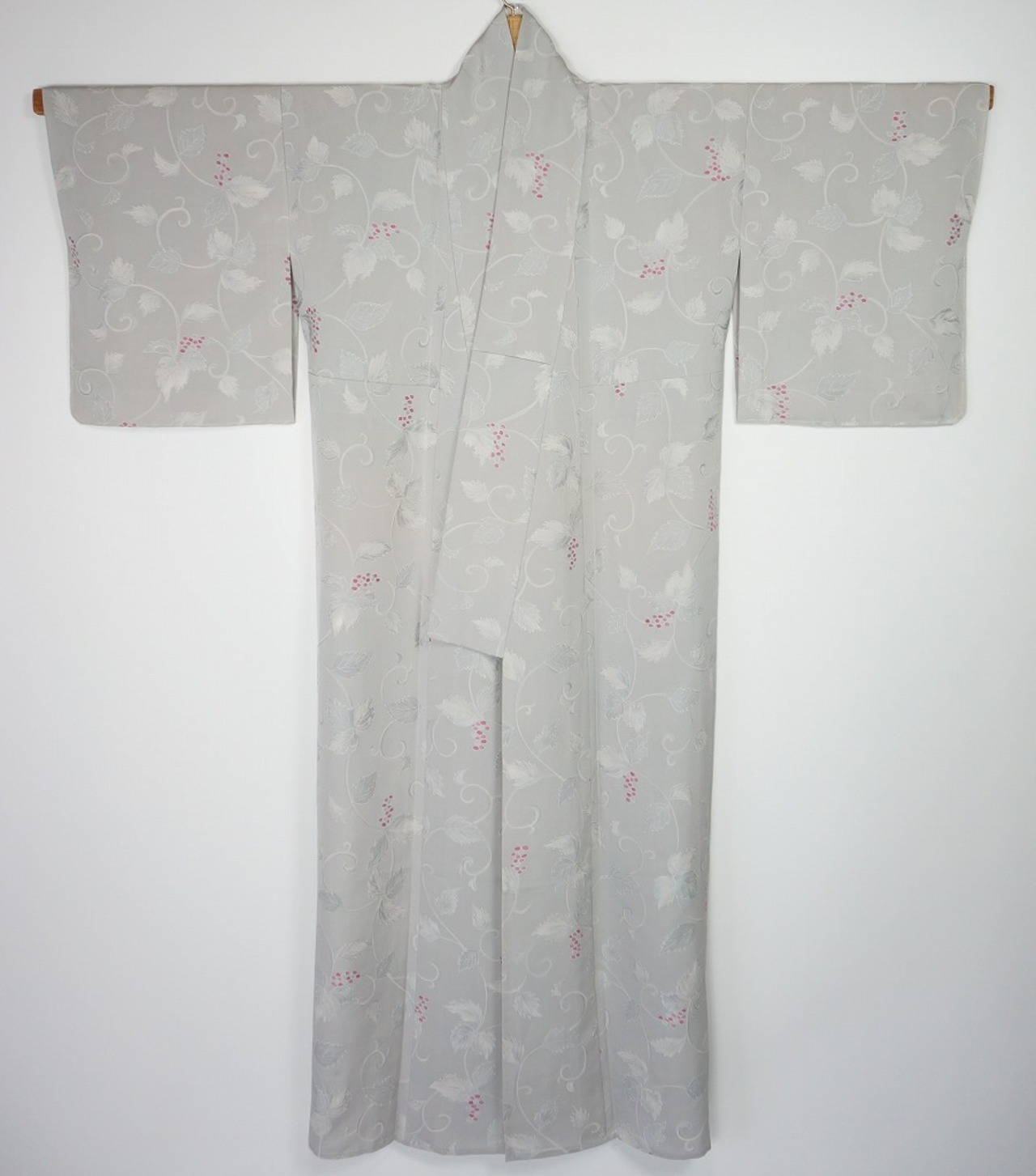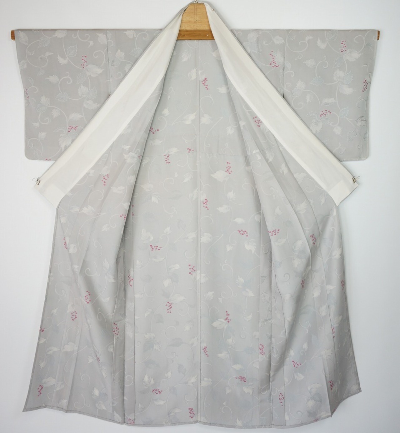 ◇美しい陰影の地紋「承華縮緬」に、淡いグレーと葡萄の紫のアクセントがとても素敵な「単衣」の高級小紋です。